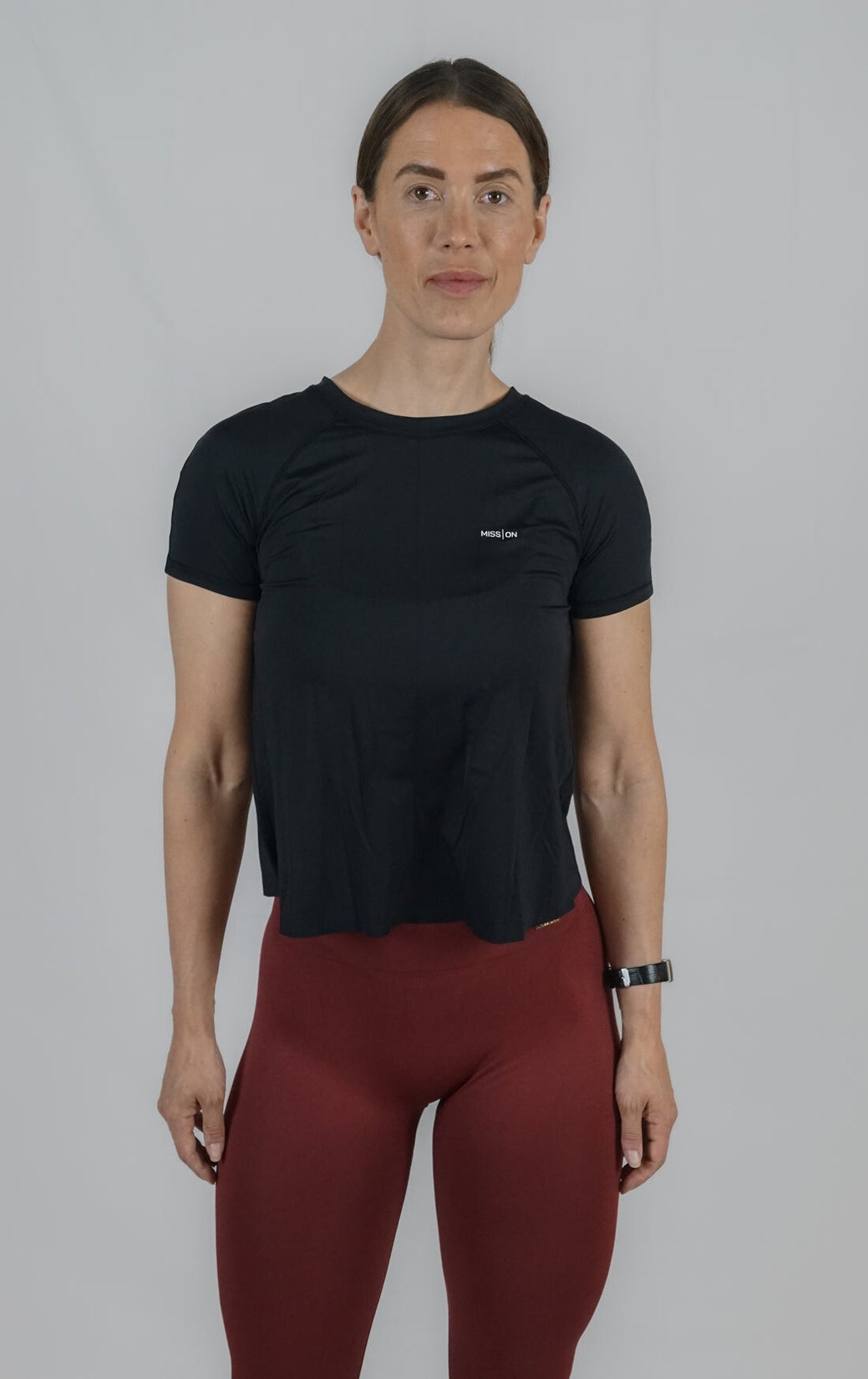 Tillverkad av ett extra tunt och lent material som andas, den ger en känsla av lätthet och ren bekvämlighet hela dagen. Den välplacerade U-ringningen är något högre vid halsen, vilket skapar en elegant look, medan det korsade tyget baktill ger en modern och delvis öppen design. T-shirten går ned till midjan.